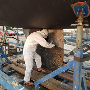 Kot vsako leto je tudi letos prišel čas za čiščenje podvodnega dela trupa, ki smo ga opravili v Crikvenici. Že pred samim dvigom na dvigalki, smo opazili predčasno v vodi, da so se samo na kobilici pojavili mehurji, kar je pomenilo, da je voda prišla pod samo zaščito. Najprej smo jadrnico dvignili v petek zvečer in jo z pritiskom vode očistili. Ko se je trup osušil, smo se lotili najprej kobilice, katero smo v živo zbrusili. Potem pa je sledilo nekaj nanosov primerja pred samo antivegetativno zaščito po kobilici. Naslednje jutro in potem po nekaj urah pa smo po celem podvodnem trupu nanesli samopolirno zaščito International Micron 350. Pri obnovi podvodnega dela pa smo zamenjali tudi vse cink protektorje.